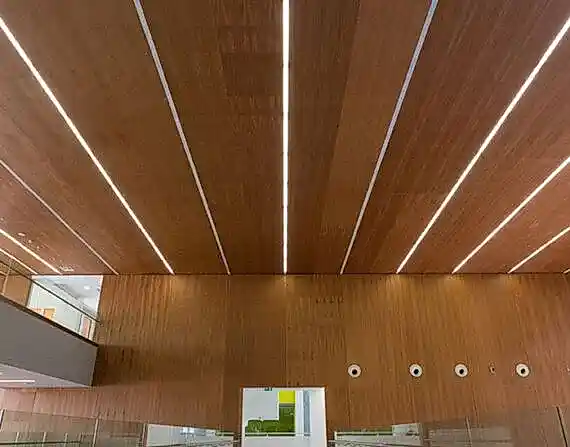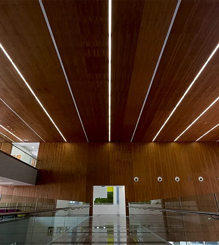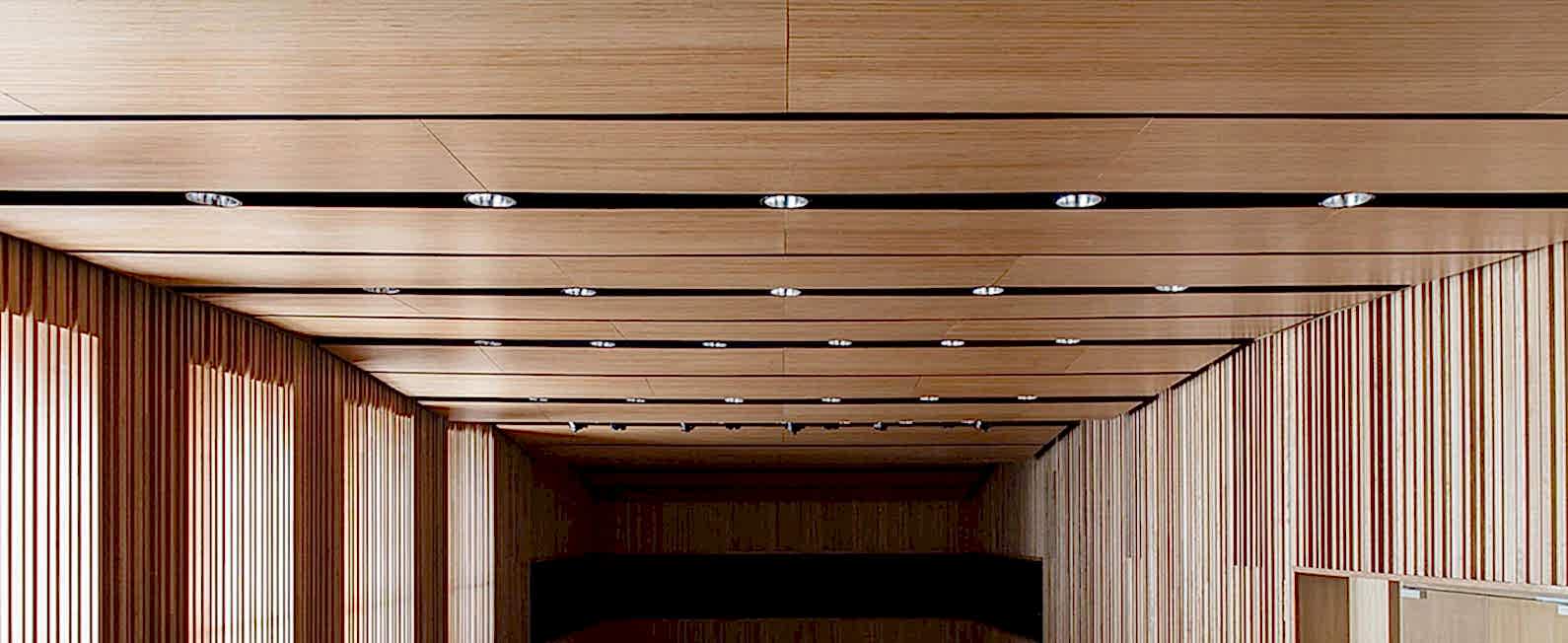 Akustik düzenleme ve dekoratif amaçla tercih edilen delikli ahşap paneller, uygulandıkları ortamdaki yankı ve çınlamaları keserek muhtemelen bir akustik sağlamaktadır.