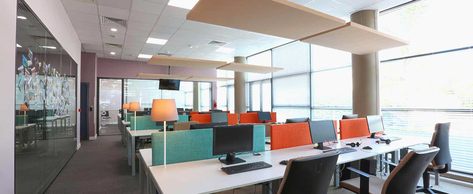 Tavan baffle ile ortamın dekorasyonu sağlanırken akustiği düzenlenir.